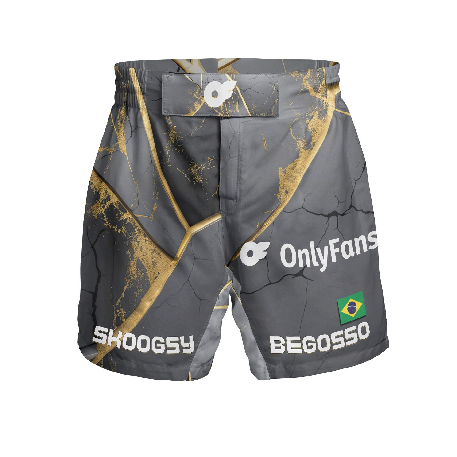 You can personalize your fight shorts with a custom word, name, or initials on the left thigh and the "belt buckle" area. Additionally, you can add a flag to the left leg to represent your nationality or personal pride.