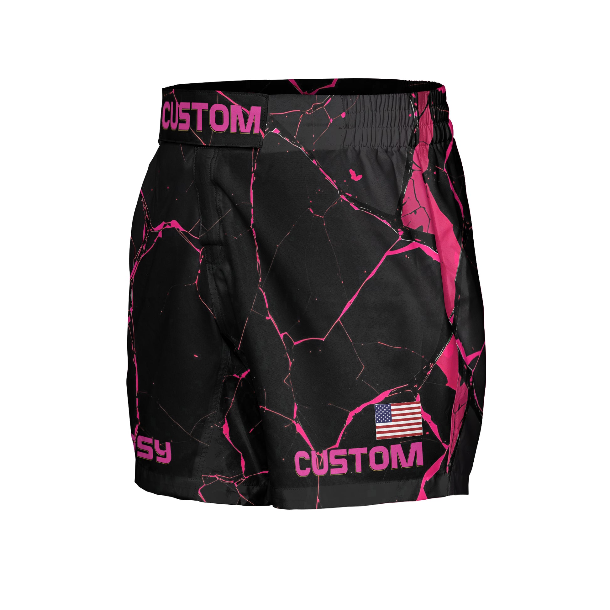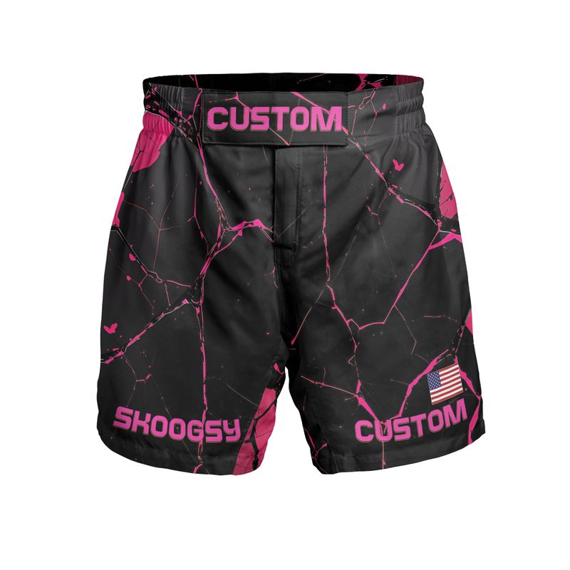 Add your name, country flag, or personal text to make them yours. Perfect for training, sparring, and competition. Built for fighters and athletes, these durable fight shorts symbolize resilience and strength with a Pink Magenta and black Kintsugi pattern. Customize them with your name, logo, or initials on the belt buckle and left leg, plus add a flag to represent your roots.