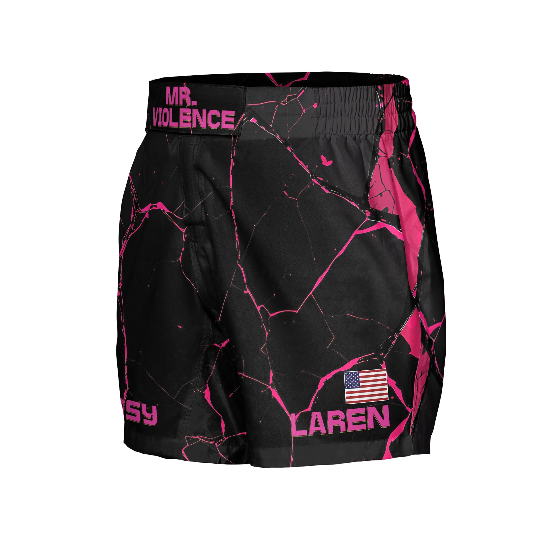 You can personalize your fight shorts with a custom word, name, or initials on the left thigh and the "belt buckle" area. Additionally, you can add a flag to the left leg to represent your nationality or personal pride.